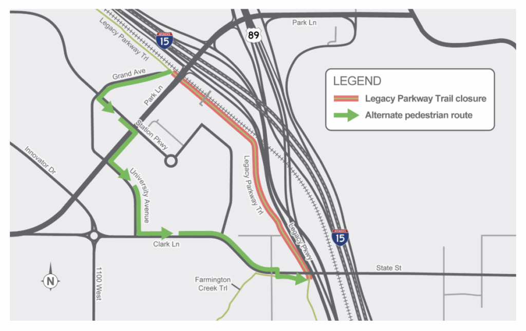 As early as Monday, May 5, the Legacy Parkway Trail between Park Lane and State Street in Farmington will be closed and fenced off for pedestrian bridge construction.