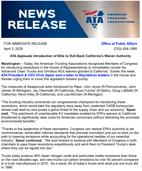 Republican members of Congress are taking steps to try and immediately roll back vehicle emissions regulations put in place by California. But whether or not it legal for them to do so remains an open question. The regulations in question are centered on the California Air Resource Board’s Advanced Clean Trucks and Omnibus NOx waivers granted to California.