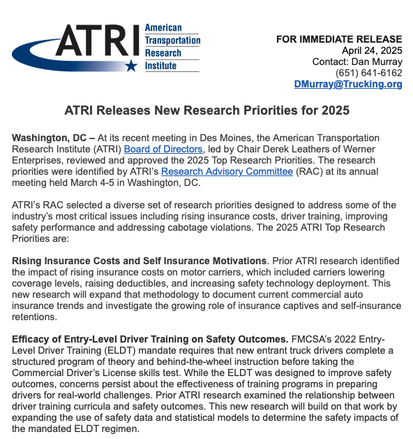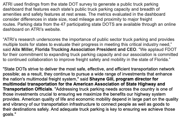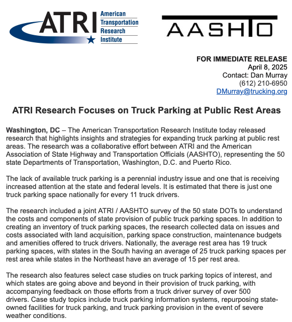 The American Transportation Research Institute (ATRI) is releasing research highlighting insights and strategies for expanding truck parking at public rest areas. The research was a collaborative effort between ATRI and the American Association of State Highway and Transportation Officials (AASHTO), representing the 50 state Departments of Transportation, Washington, D.C. and Puerto Rico.