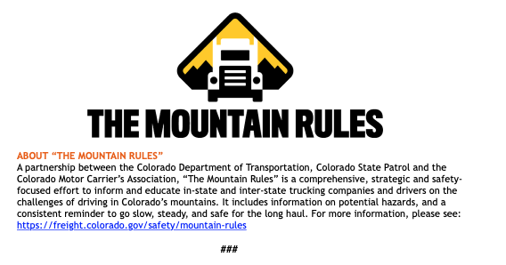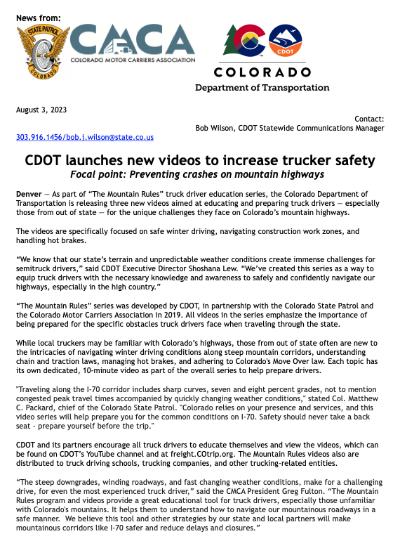 The Colorado Department of Transportation (CDOT) is releasing three new videos aimed at educating and preparing truck drivers — especially those from out of state — for the unique challenges they face on Colorado’s mountain highways.