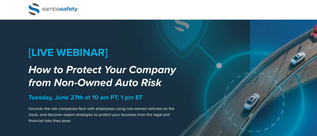 “How to Protect Your Company from Non-Owned Auto Risk” hosted by John Diana and Greg Stefan from Arch Insurance.SambaSafety is hosting the above webinar on June 27th @ 11am MT (1pm ET) Join us to uncover the risk companies face with employees using non-owned vehicles on the clock, and discover expert strategies to protect your business from the legal and financial risks they pose.