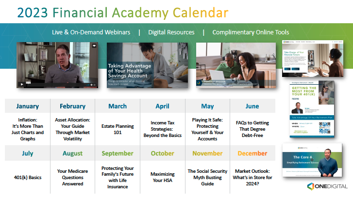 With 2022 nearly in the rearview, it’s time to shift our focus forward.  What did we learn financially in 2022?  Many of us learned that inflation is real and that the financial decisions we make today can certainly impact our future financial success.  We are pleased to provide you access to another year of financial education through our partners at OneDigital.