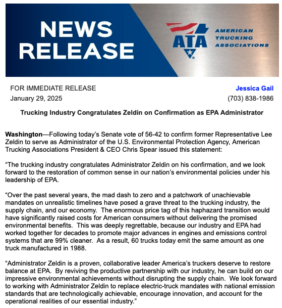 “The trucking industry and American consumers can breathe a collective sigh of relief today after CARB finally bowed to reality and shelved its job-killing Advanced Clean Fleets regulation,” said American Trucking Associations president and CEO Chris Spear. “We look forward to President-elect Trump rescinding CARB’s remaining unworkable waivers and new leadership at EPA restoring a common-sense approach that balances environmental progress with economic viability.”