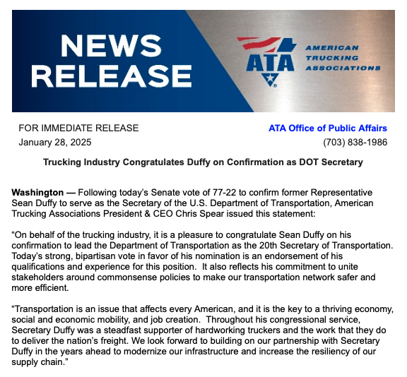 The U.S. Senate on Tuesday confirmed Sean Duffy to become the Secretary of Transportation. Duffy was confirmed by a 77-22 vote. American Trucking Associations President and CEO Chris Spear said Tuesday’s “strong, bipartisan vote in favor of his nomination is an endorsement of his qualifications and experience for this position. It also reflects his commitment to unite stakeholders around commonsense policies to make our transportation network safer and more efficient.”