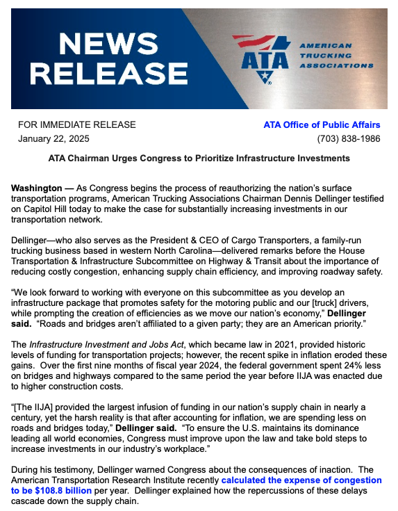 ATA’s Dellinger Calls on Congress to Repeal FET
