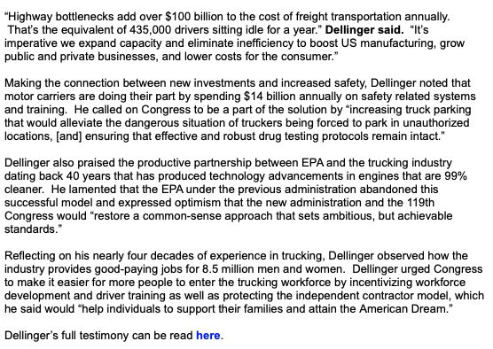 Dennis Dellinger, president and CEO of Cargo Transports and chair of the American Trucking Associations, called on Congress to repeal the federal excise tax (FET) on Wednesday. The FET was first enacted during World War I. It is a 12% tax on the sale of most heavy-duty trucks and trailers. More than $6 billion in FET was collected in 2023 from truck, trailer and semitrailer chassis, bodies and tractors sales. Industry organizations contend the tax is a barrier to the sale of new, more efficient tractors.