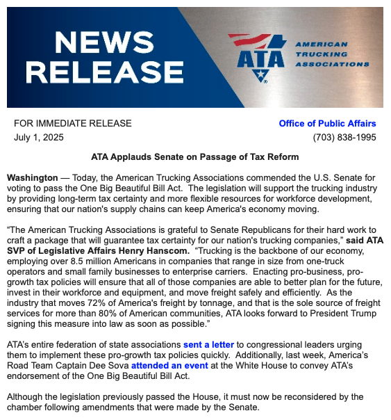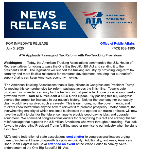 Dozens of freight and trucking stakeholders praised the recently enacted comprehensive tax and budget measure referred to as the “One Big, Beautiful Bill.” American Trucking Associations pointed to the new law’s potential benefits for a freight sector enthusiastic about an economic boost this year.
