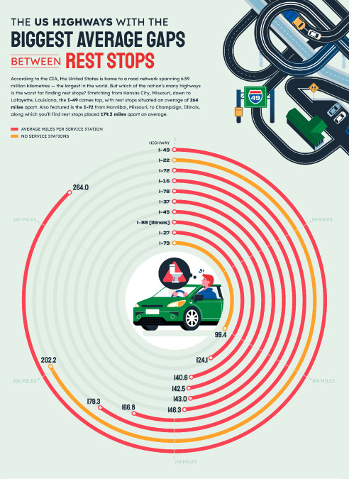 This new study from QS Supplies analyzed rest area data along highways in order to find the U.S. highways with the biggest gaps between rest stops.