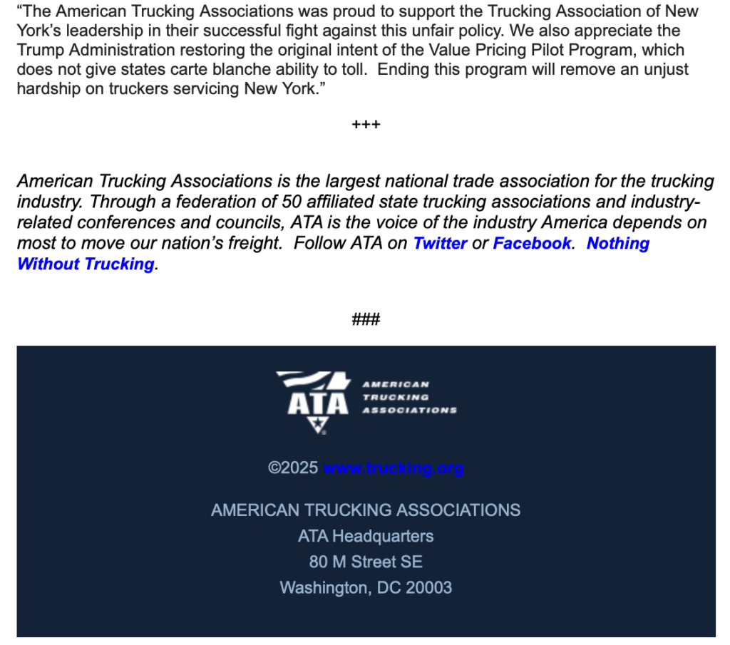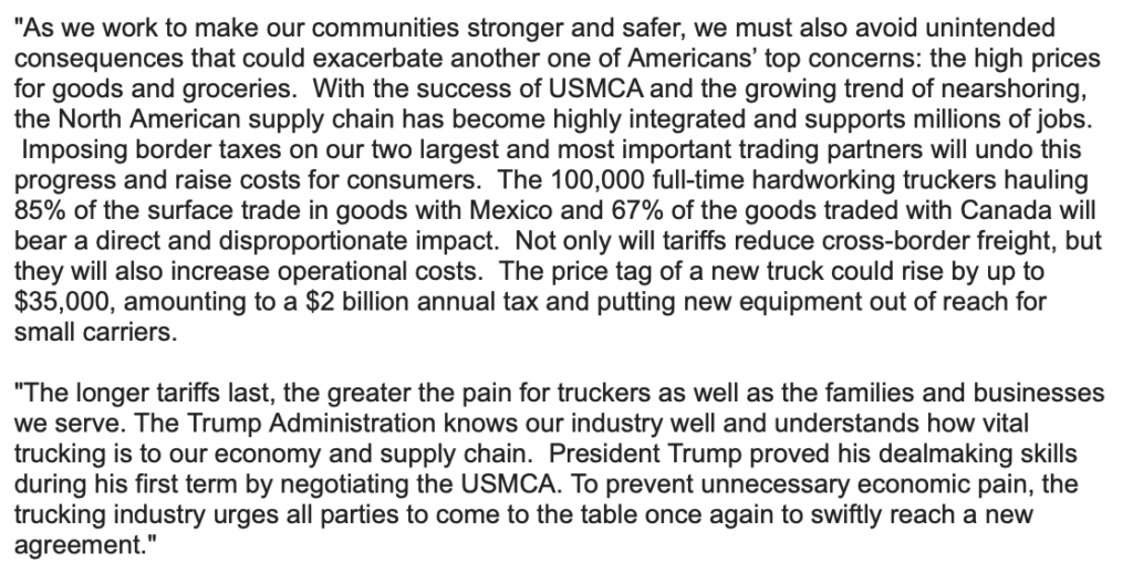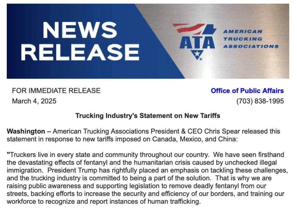 The American Trucking Association issued a statement regarding its position on the new tariffs.