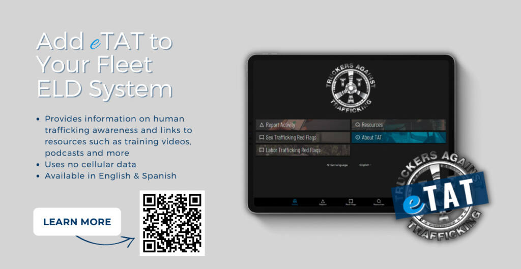 TAT came out with an ELD-friendly platform called eTAT. It’s designed with ELDs in mind and is stripped of all cellular data, and holds links to resources such as training videos, podcasts, and more. It allows drivers to have that guidance to identify and report human trafficking.