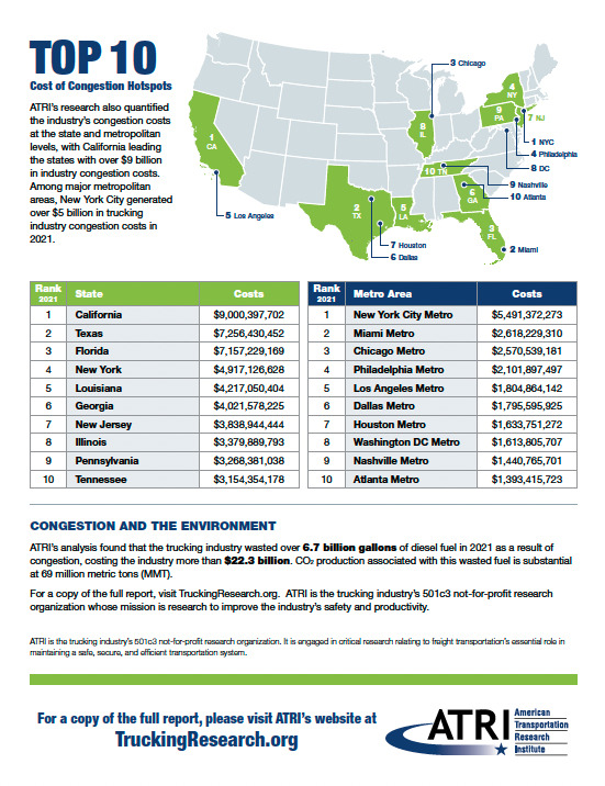 Traffic congestion on U.S. highways added $94.6 billion in costs to the trucking industry in 2021 according to the latest Cost of Congestion study published by the American Transportation Research Institute. ATRI said it utilized a variety of data sources including its unique truck GPS database to calculate trucking delay impacts from 2017 through 2021 on major U.S. roadways.