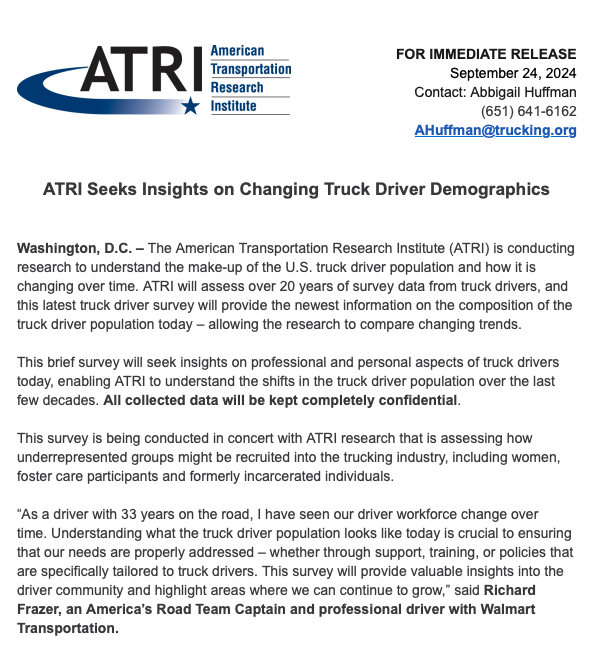 The American Transportation Research Institute announced a new survey to evaluate truck driver demographics and changes over recent decades. The 20-question survey asks drivers to share the class of CDL they hold, the types of commodities they haul and questions relating to their race, gender, experience, earnings level, company size and other demographic data.
