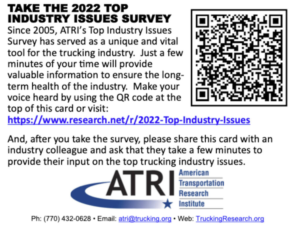 The American Transportation Research Institute (ATRI) on Monday launched its 2022 Top Industry Issues Survey, an annual query to trucking industry stakeholders asking them to rank the top issues of concern for the industry along with potential strategies for addressing each issue.